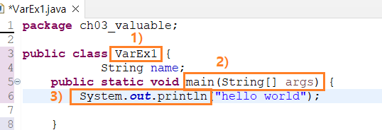 1)varEx1.java 파일이 class varEx1 클래스 명과 동일해야한다. 2)main이 실행 메소드. 다른 메소드가 많아도 메인에서 실행된다. 3)syso+ctl+spac 자동완성된다. |