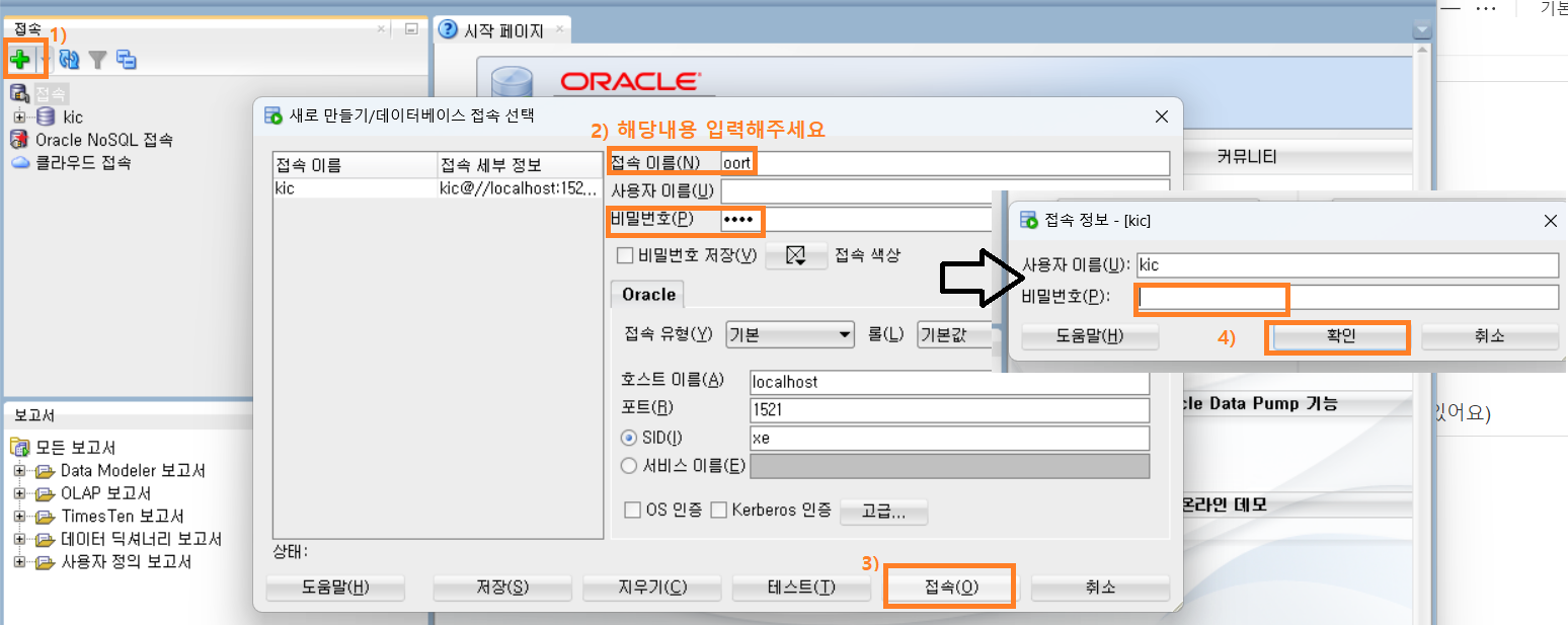 *sql 데이터 베이스 관리를 위해 오라클을 배웁니다. ------- ver. oracle :OracleXE112_Win64.zip sqldeveloper :sqldeveloper-4.1.3.20.78-x64.zip ----- 오라클의 경우 로그인이 필요합니다. 회원가입 후 다운로드 진행해주세요~ 해당 파일을 다 다운받은 후. cmd 창을 켭니다. *sqldeveloper 에 사용할 아이디 만들기 1)sqlplus system/1111 -> user를 만들때에는 system user에서 실행 (admin 계정) 2) create user oort identified by 1234; (이후 아이디와 비밀번호를 꼭 기억해둡니다.) -> User created 3) login 권한 grant resource,..